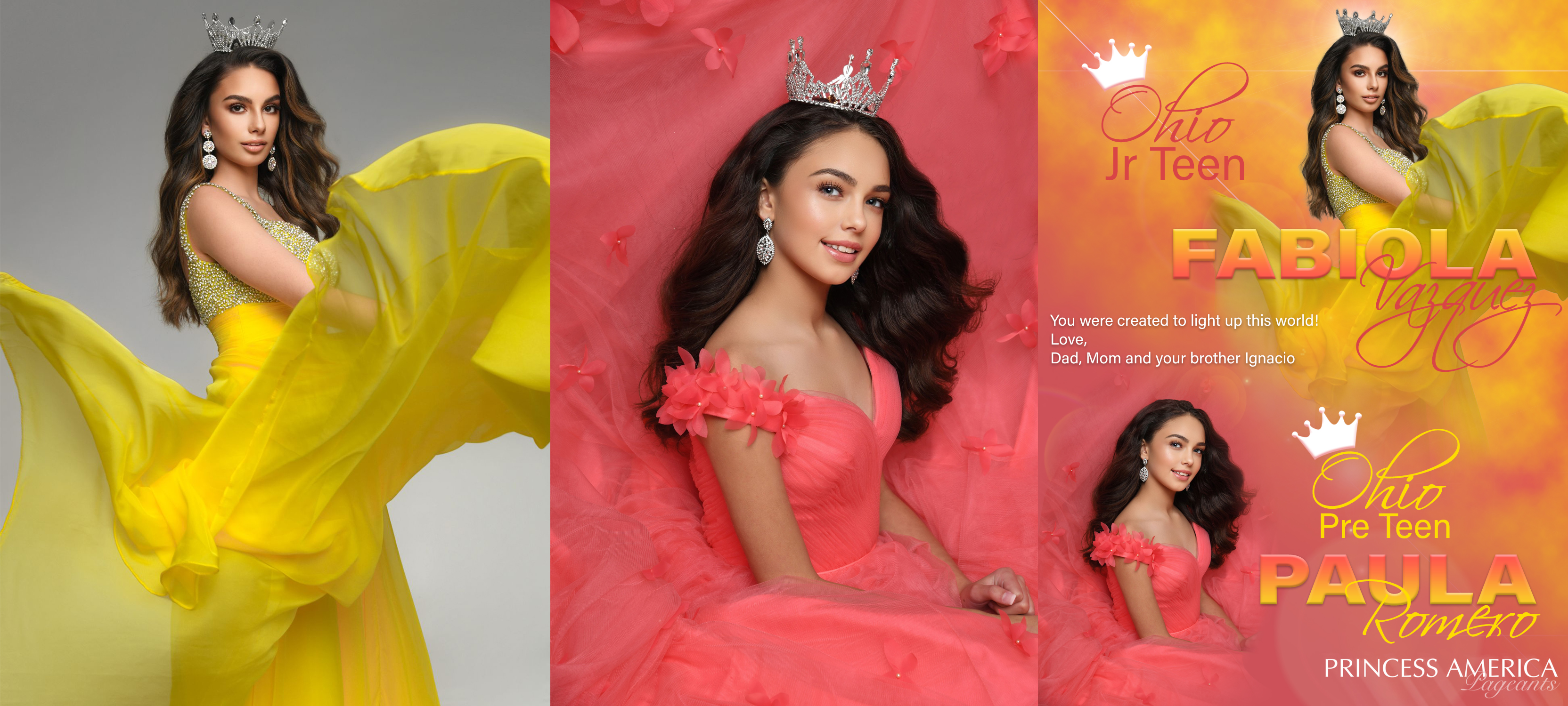 I did this combination ad for sisters, Fabiola and Paula, for their participation in the Princess America Pageant. The two photos on the left are the originals. I had to digitally remove Paula's crown and blend her colors with Fabiola's to get this bright smokey look.